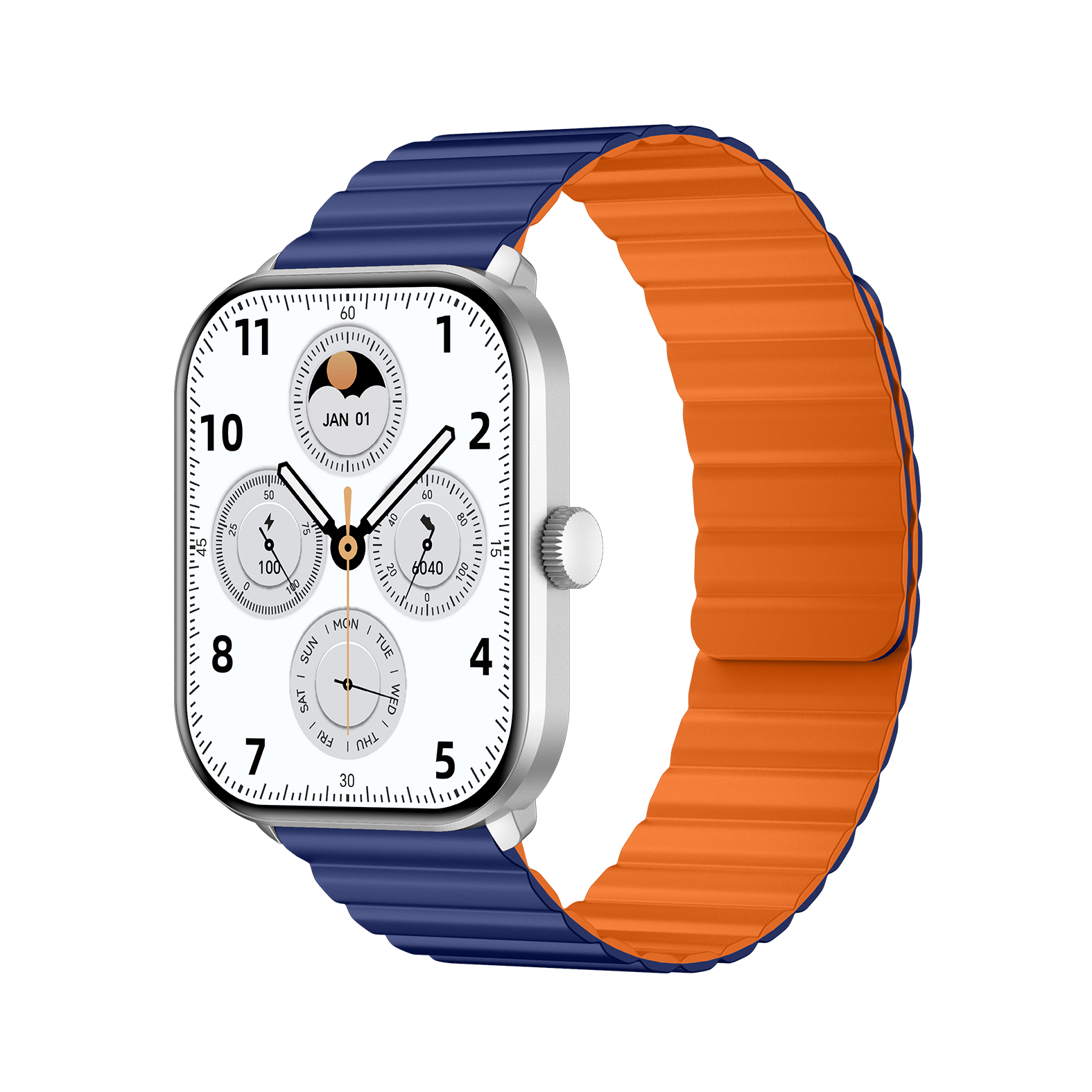 - بدنه نقرهای با بندهای سیلیکون مگنت آبی-نارنجی و سیلیکونی خاکستری