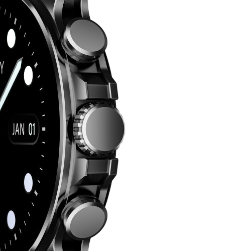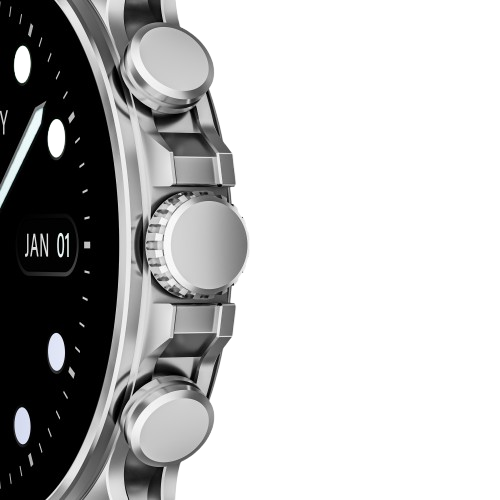 بند سیلیکونی برای استفاده های ورزشی و روزمره مناسب است، زیرا ضد تعریق و ضد حساسیت است. بند چرمی نیز برای موقعیت های رسمی و مهمانی ها مناسب است و ظاهری شیک و کلاسیک به ساعت می بخشد.در سمت راست بدنه، به جای دو دکمه، سه دکمه گرد از آلیاژ آلومینیوم تعبیه شده که دکمه وسط به صورت فشاری و چرخشی قابل استفاده است، در حالی که دو دکمه کناری فقط به صورت فشاری عمل می کنند.