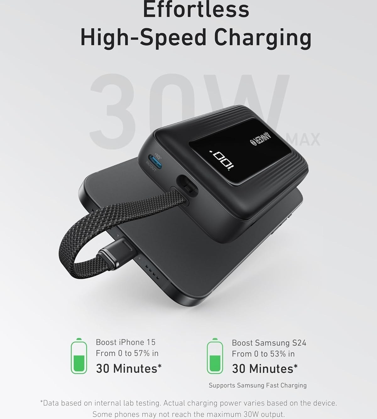 پاوربانک Anker A1689 از تکنولوژی Power Delivery 3.0 پشتیبانی میکند که سرعت شارژ دستگاههای شما را به طور چشمگیری افزایش میدهد. این تکنولوژی میتواند باتری دستگاههایی مانند iPhone 15 یا Samsung Galaxy S24 را به سرعت شارژ کند. به طور مثال، قادر است گوشی را در مدت زمان کوتاه (حدود ۳۰ دقیقه) تا ۵۷٪ شارژ کند.